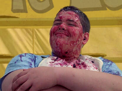To entertain his preadolescent friends during a reprieve from their quest to find a corpse, Gordie Lachance (Wil Wheaton) invents the campfire tale of Davie "Lardass" Hogan (Andy Lindberg) halfway through this timeless adaption of Stephen King's The Body. By Lachance's account, Hogan extracts unholy retribution from the townspeople who've mercilessly mocked his weight for years by exploiting their weak stomachs and hair-trigger gag reflexes at the Great Tri-County Bake Off & Pie Eat. He chugs a bottle of castor oil and a raw egg before competing in the blueberry pie-eating contest, ensuring that a dessert explosion interrupts the completion of his fifth pie. The sight of Hogan's hurling prompts a similar reaction from his opponents, which grosses out the crowd, causing their own collective gastrological ejection. Oddly, the contents of everyone's stomachs look quite a lot like blueberry pie filling, regardless of whether they were participating in the contest.
